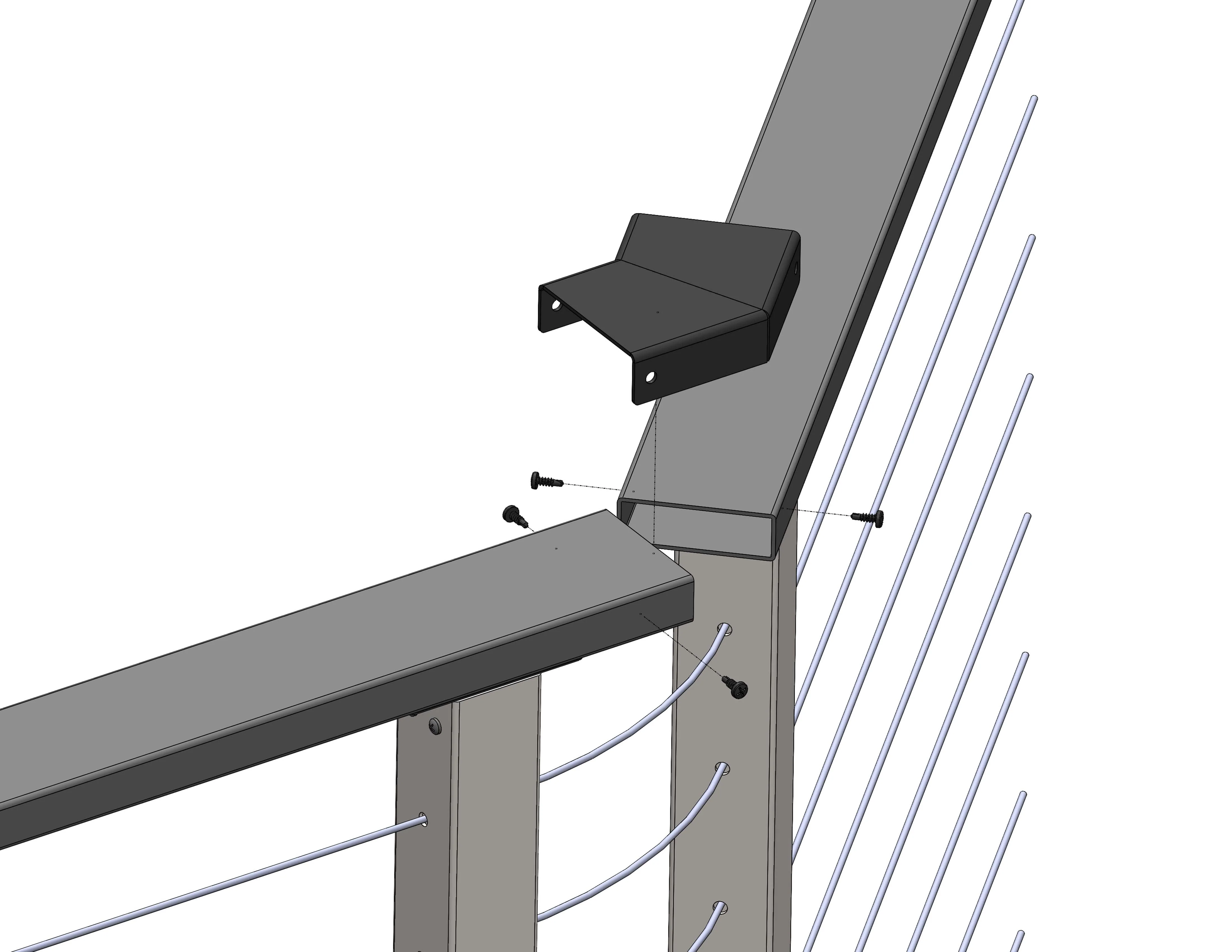 This 45 degree sleeve joins together two CityPost cable railing segments at 45 degrees. The sleeve is made from powder coated aluminum and fits over the top of the straight handrail. It attaches by simply joining with the 4 included screws.